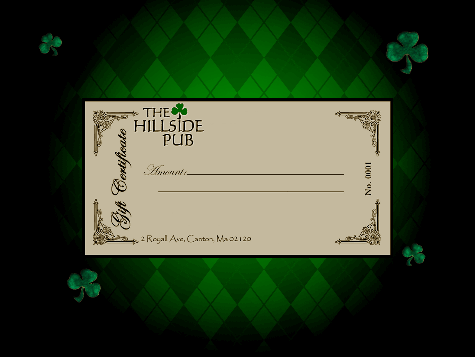The Hillside Pub offers Gift Certificates in a variety of denominations.